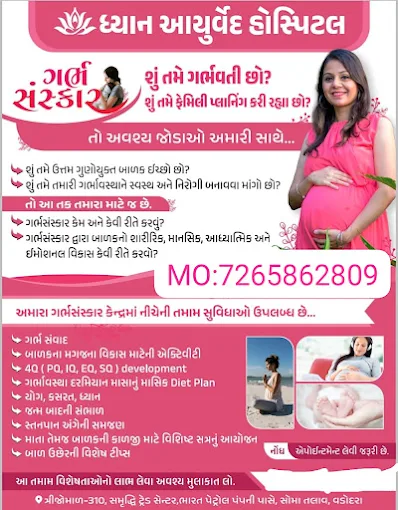 Dhyan Garbh Sanskar offers and helps in the journey of pregnancy to parenting. Facilities: Garbh Samvad, Baby brain development activities, Baby 4Q development, Monthly diet plan Breast feeding care, Mother care, Baby care, Pregnancy yoga, Exercise and meditation, Parenting tips, Personal counselling, Chanting mantras, Post Pregnancy Care.